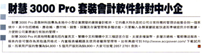 、內置報表編輯器及使用者權限管理等。如有興趣可以到http://www.accpower.com下載試用版。單用戶版的售價為$4,800,五個用戶版是$9,800。大家可致電2857